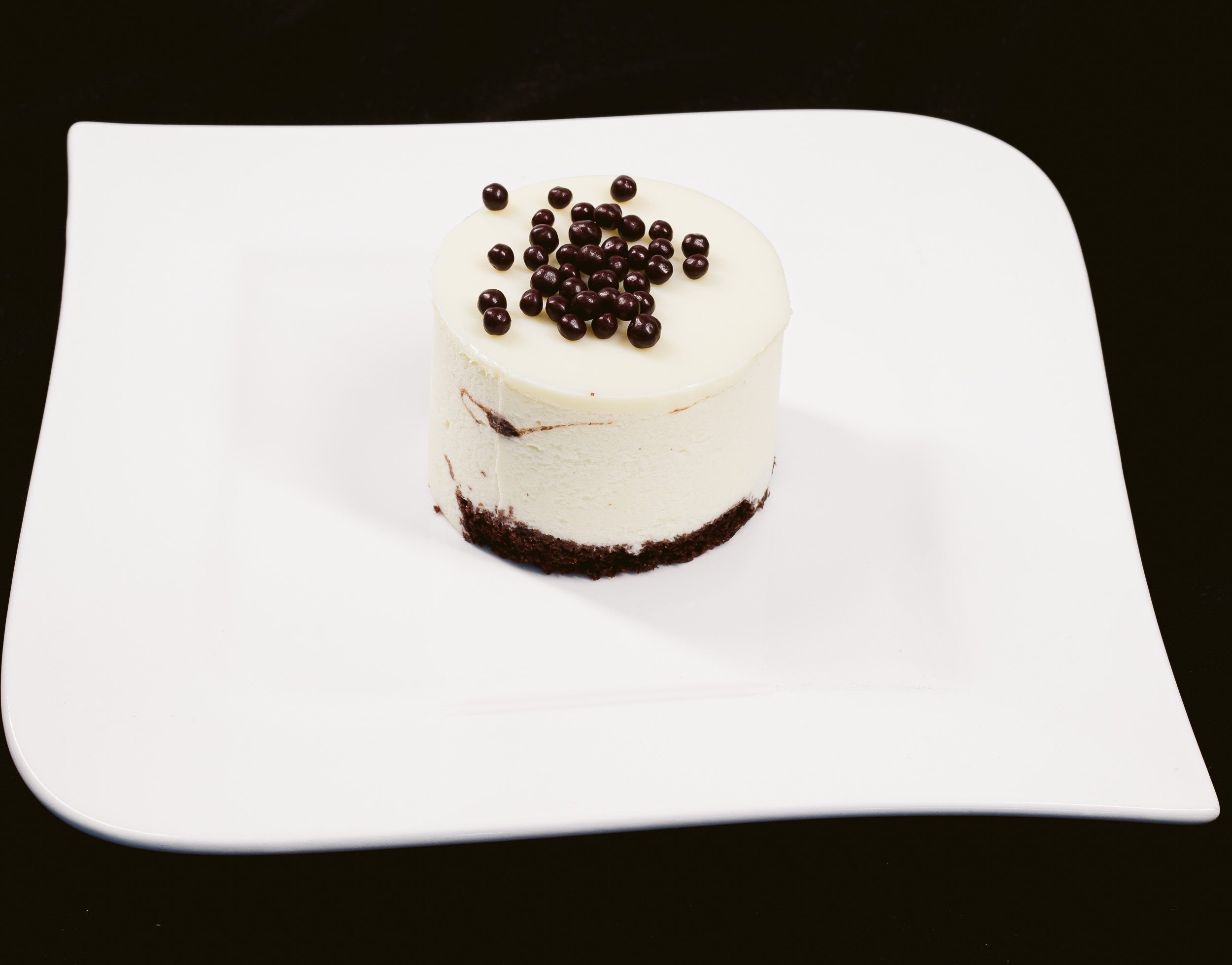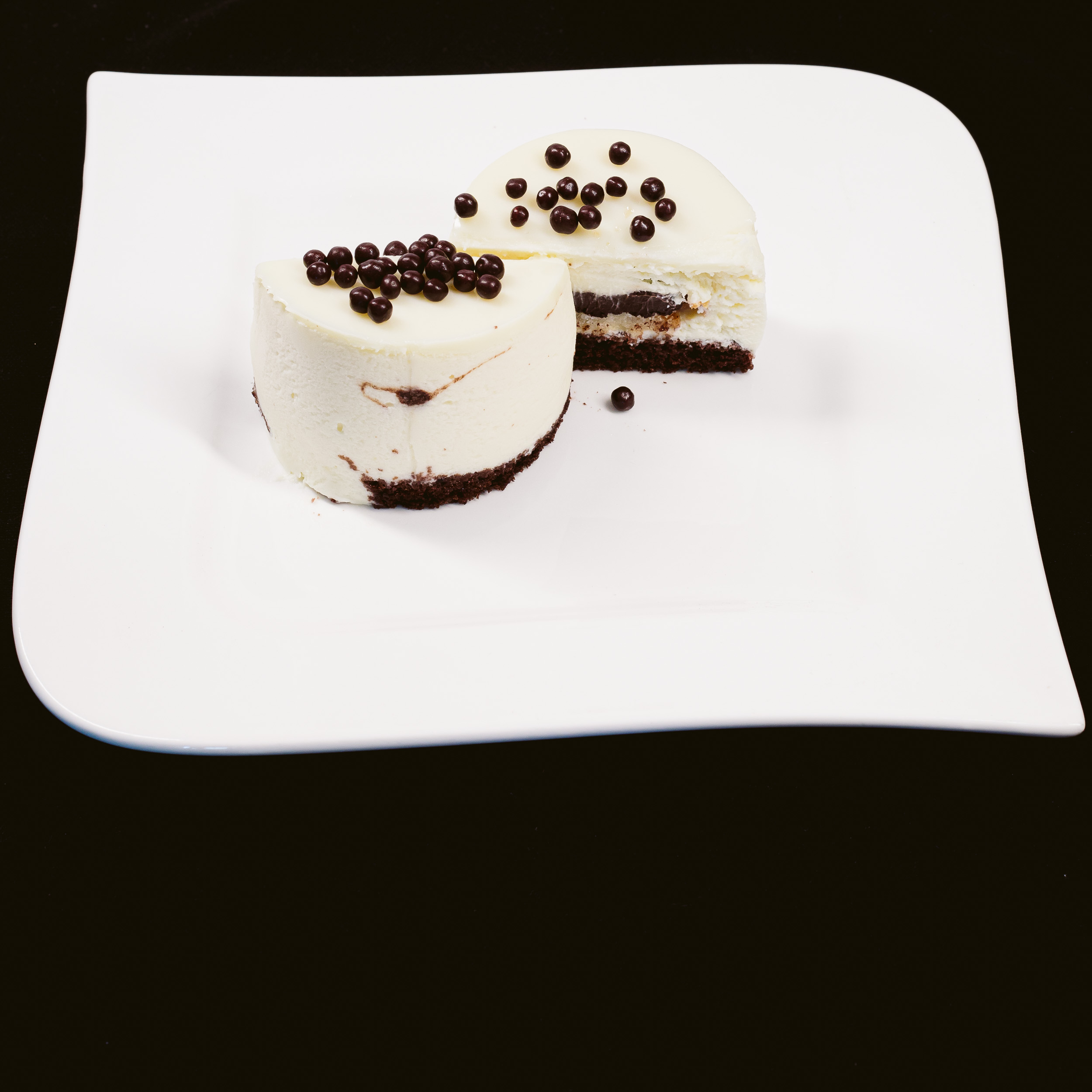 Ouă, zahăr, lapte, ciocolată albă (min.28% masă de cacao), ciocolată neagră (min. 54.5% masă de cacao), frișcă, făină de grâu, făină de migdale, unt, ulei de floarea soarelui, cacao, gelifianți: gelatină alimentară si pectină din fructe, emulgator: amidon din porumb, agent de creștere: praf de copt, aromă naturală de vanilie, sare. Alergeni: ouă, lapte, gluten, soia. După achiziționare se recomandă a se păstra la frigider la +2…+8 grade C și a se consuma în termen de 24 ore. Procesul tehnologic de obținere a produsului implică congelarea (*produs/din produs decongelat).