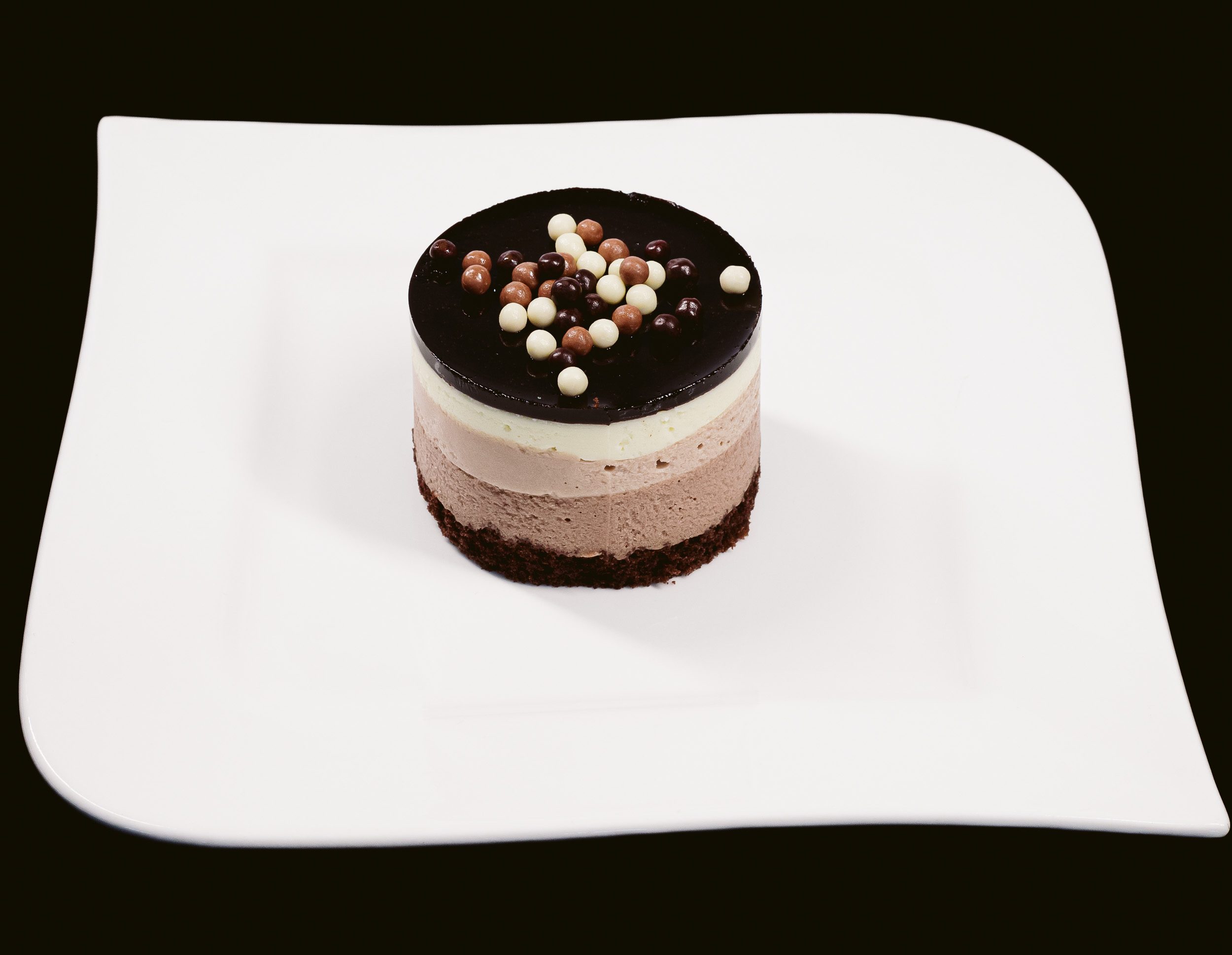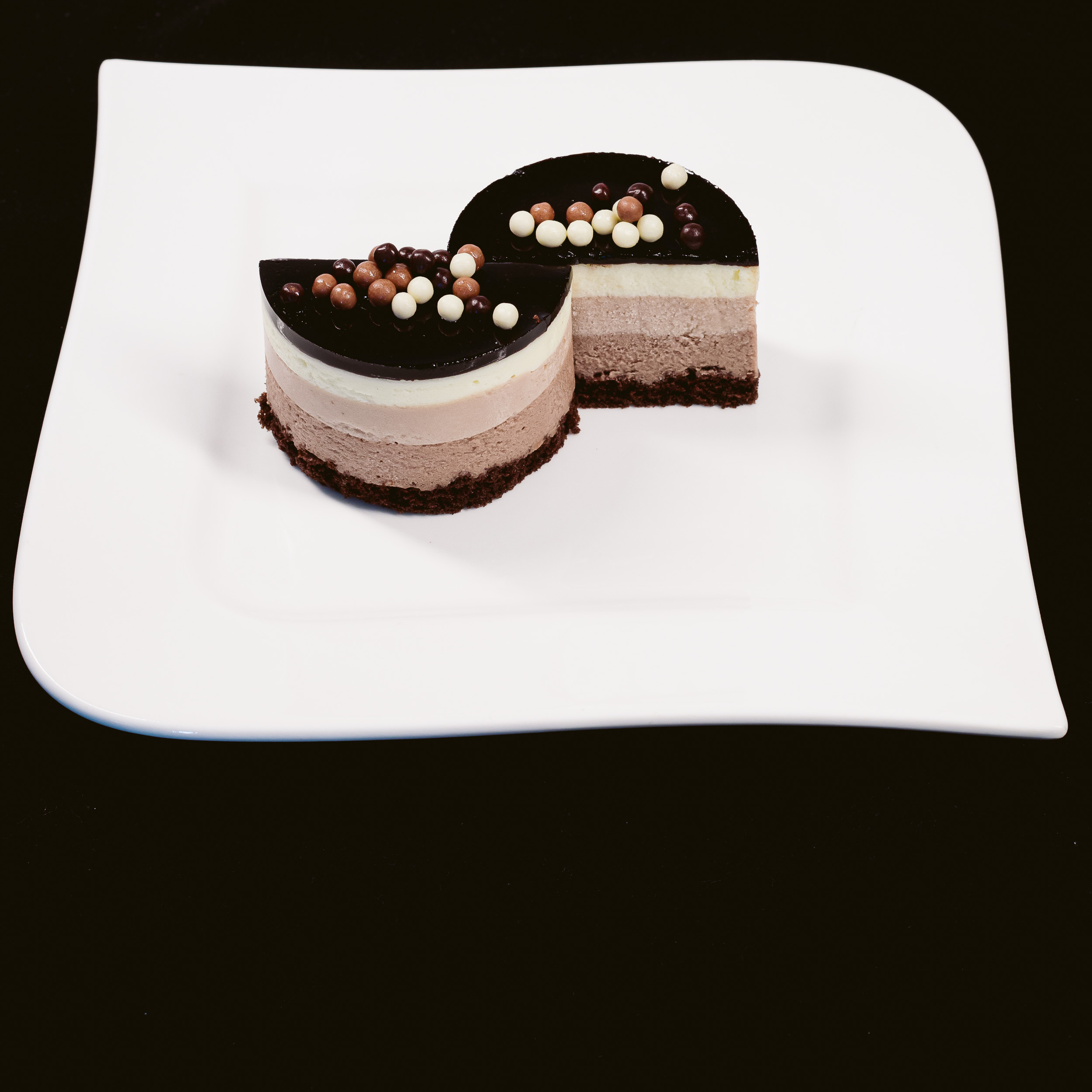 Un clasic al cofetăriei internaționale: mousse din trei feluri de ciocolată (neagră, lapte, albă).