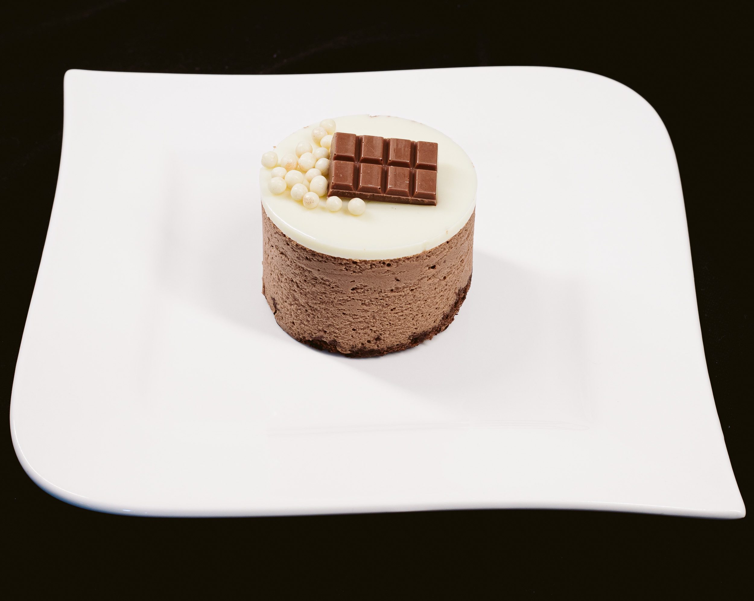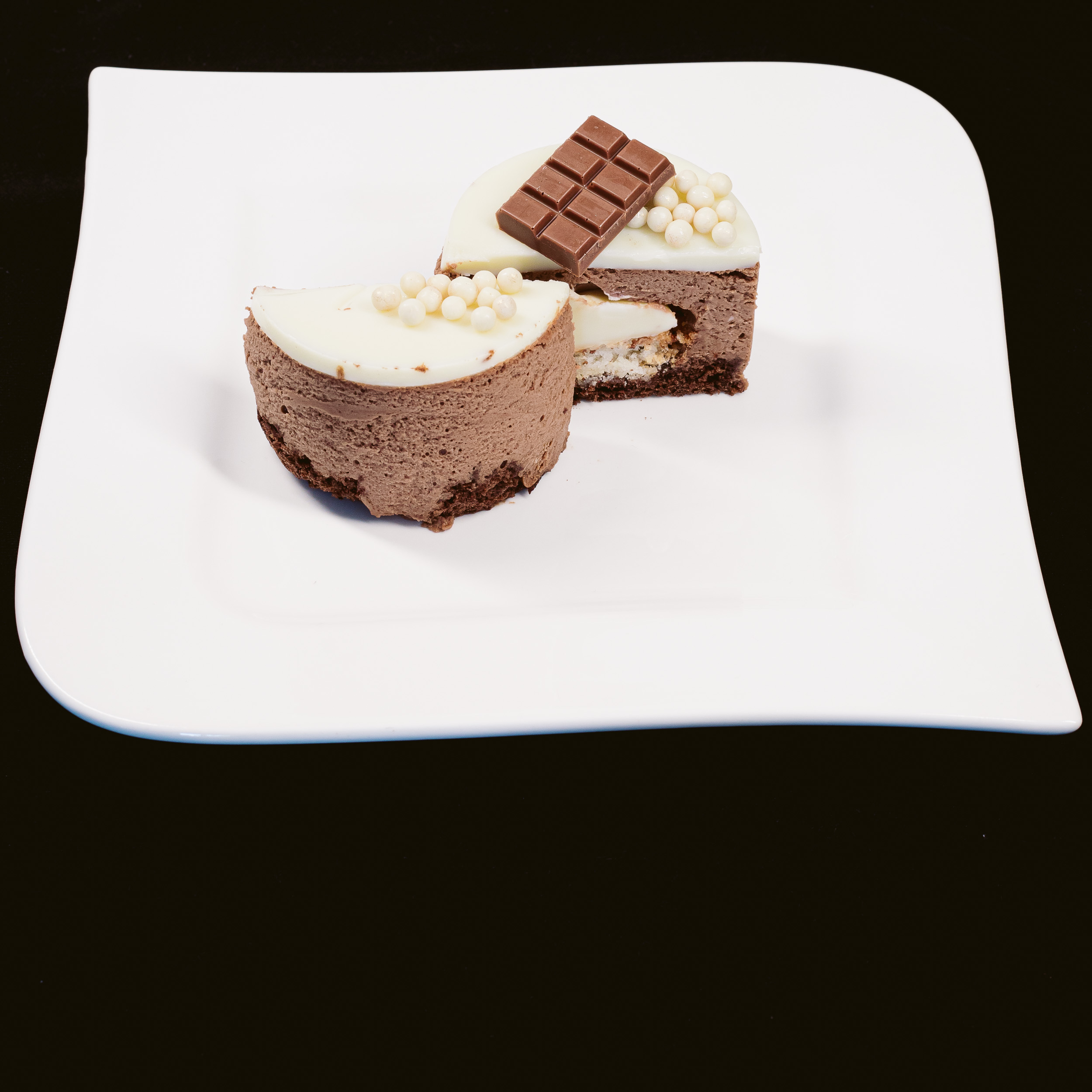 Combinație de mousse de ciocolată neagră, inserție cu bezea de migdale, cremă de ciocolată albă cu vanilie și glazură de ciocolată albă.
